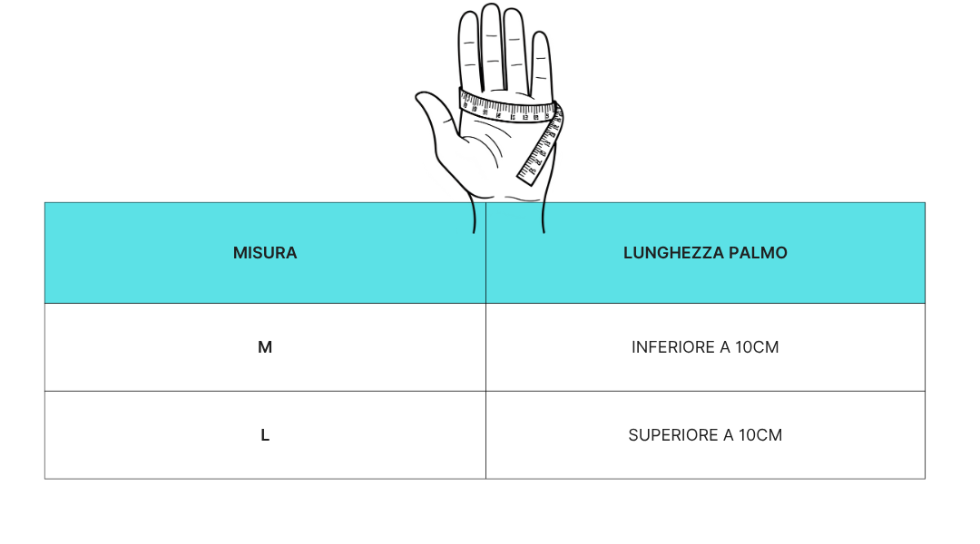 Misura la lunghezza del palmo al livello delle nocche, lato interno. Successivamente confrontalo con la tabella di riferimento